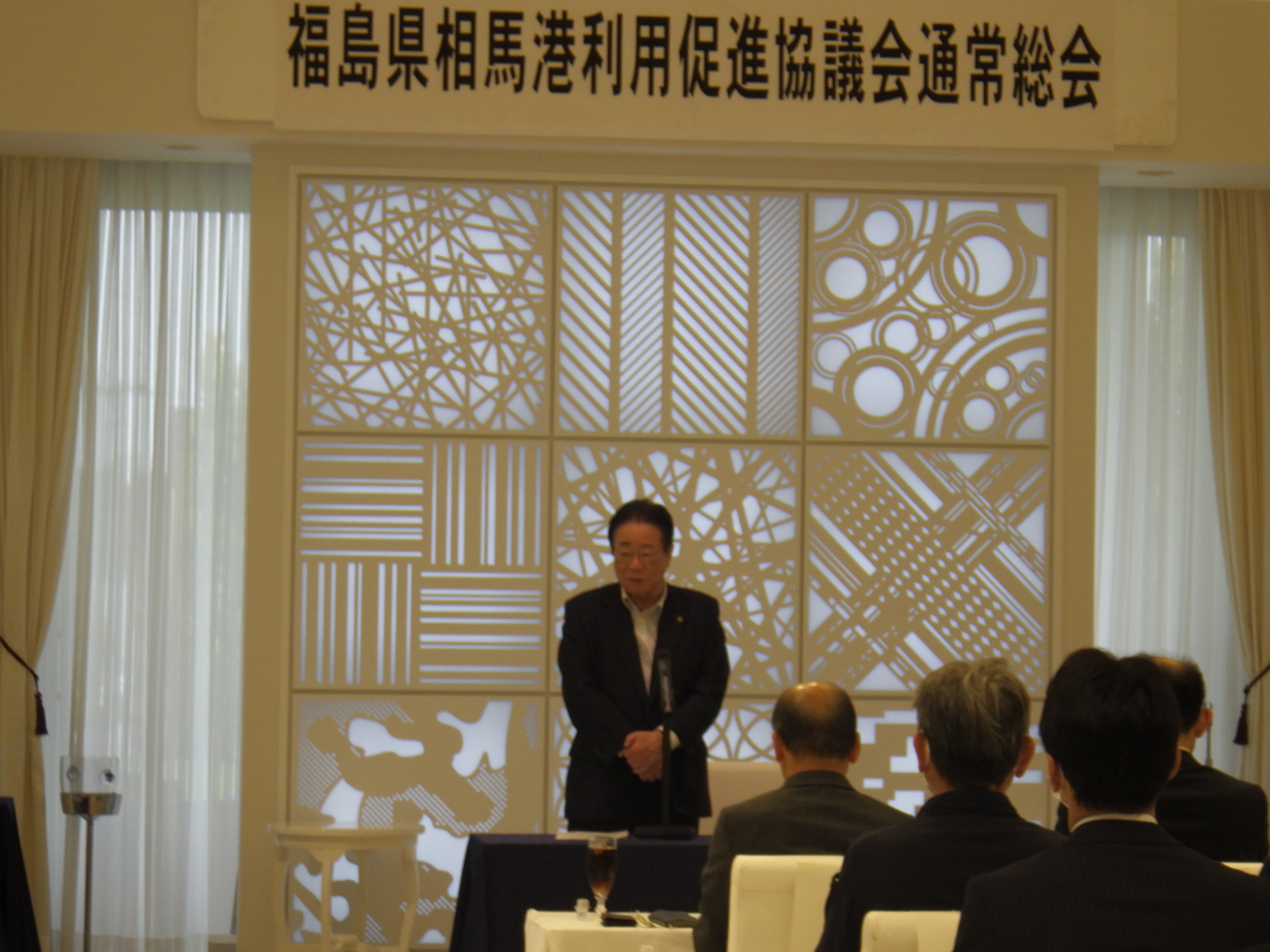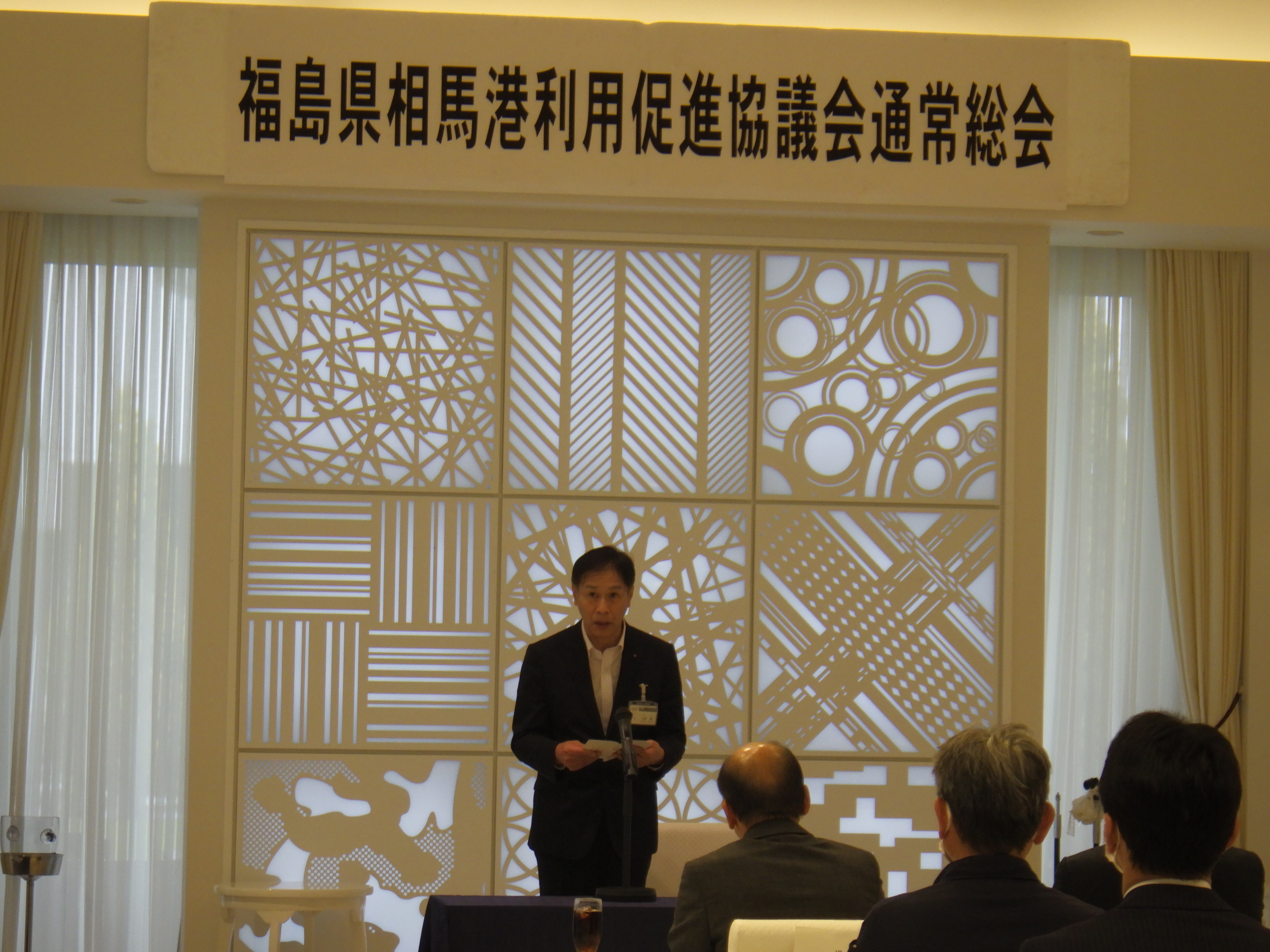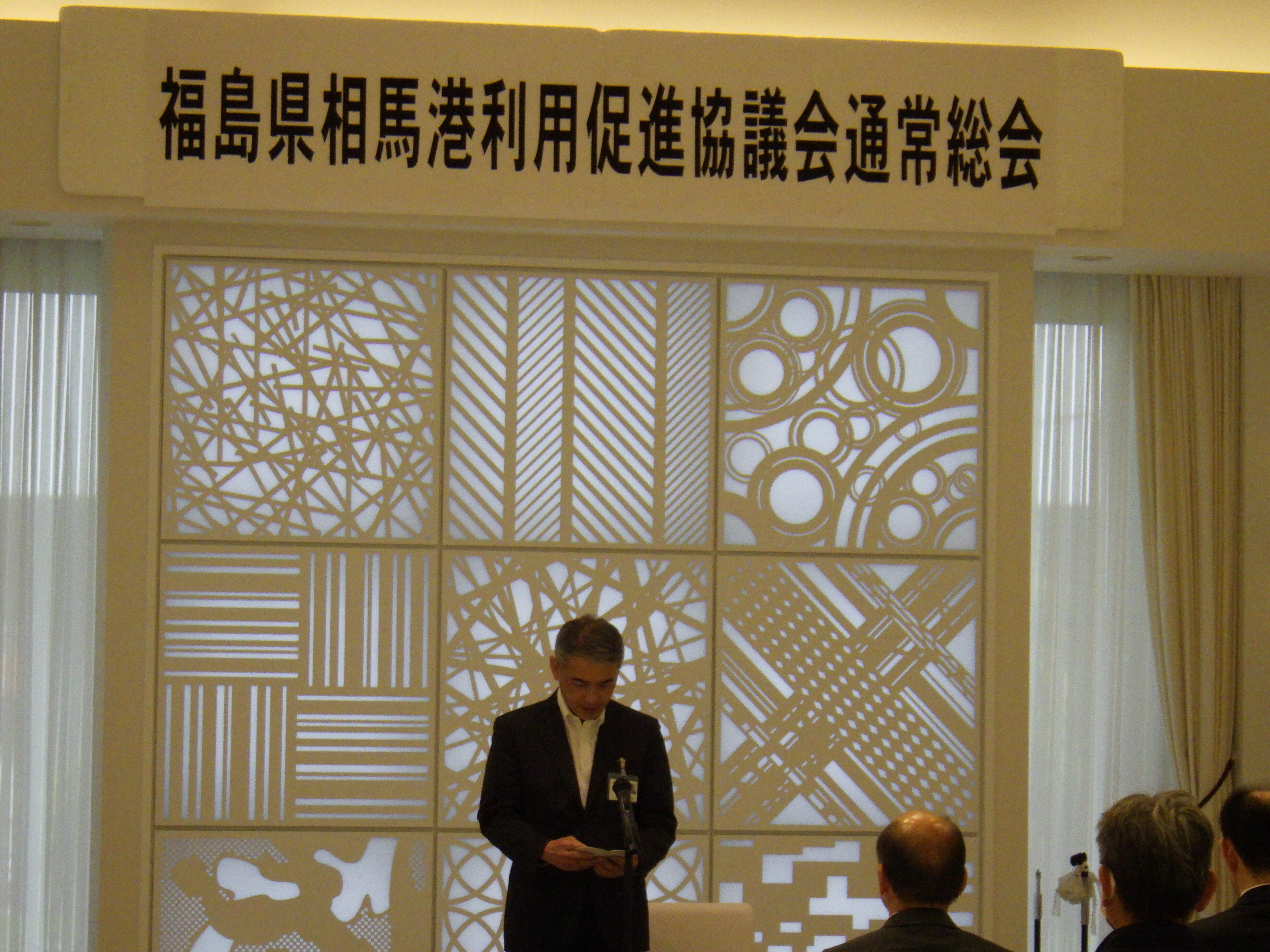 副会長である大堀武新地町長による開会に続き、会長である立谷秀清相馬市長があいさつ。続いて名誉会長である内堀雅雄福島県知事の代理として猪股慶藏福島県土木部長、尾﨑精一小名浜港湾事務所長より祝辞をいただきました。